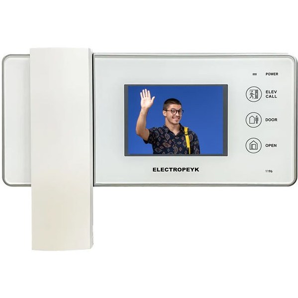 آیفون تصویری الکتروپیک 1196 با صفحه نمایش رنگی از نوع TFT LCD که دارای فناوری نور پس ضمینه با وضوح تصویر بسیار بالایی است ، یک نوار خاکستری رنگ دو تا دور آن را پوشانده است. ساختار کلی این طرح که تنها در برند الکتروپیک دیده میشود الهام گرفته شده از برند سامسونگ میباشد که در سمت راست این مدل در ابتدا چراغ Power درستگاه قرا دارد که که زمانی که دستگاه روشن است چراغ LED آن نیز فعال می باشد. و در زیر آن سه دکمه لمسی LED به کار رفته در سمت راست این مدل همانند مدل 3.5 اینچ به ترتیب وظیفه ی فراخوانی آسانسور ، مشاهده تصویر بدون باز کردن ، کلید باز کردن درب ورودی میباشد.