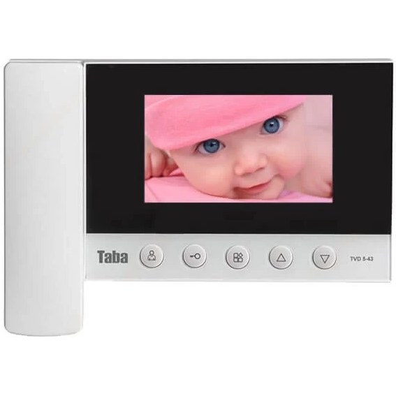 آیفون تصویری تابا TVD5-43 دارای یک صفحه نمایش 4.3 اینچی است که از فرمت PAL برای نشان دادن تصاویر استفاده می کند؛ که یک تصویر واضح از محیط بیرون را به ما نشان می دهد. این صفحه نمایش 4.3 اینچی درون یک کادر مشکی رنگ قرار دارد و دکمه های آن در پایین مانیتور به روی یک نوار سفید رنگ قرار گرفته اند که به شکل دایره می باشند. هندست این مانیتور مقداری بلندتر از بدنه آن است که باعث افزایش راحتی کاربر در هنگام استفاده از آن شده است.